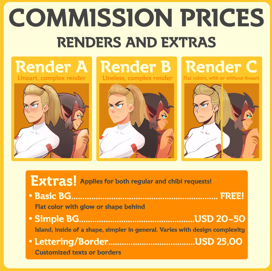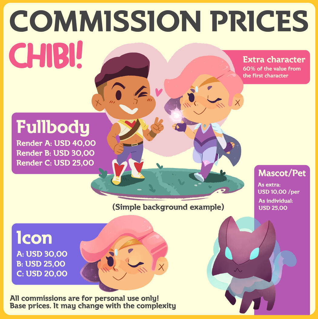 Heyoo! Thank you for being interested on commissioning me!Here are the base price sheets for illustrations of personal use only. Prices may change due designs complexity!Please don't forget to read the Terms of Service! If you proceed with the commission request, I will consider that you read and agreed with the terms.