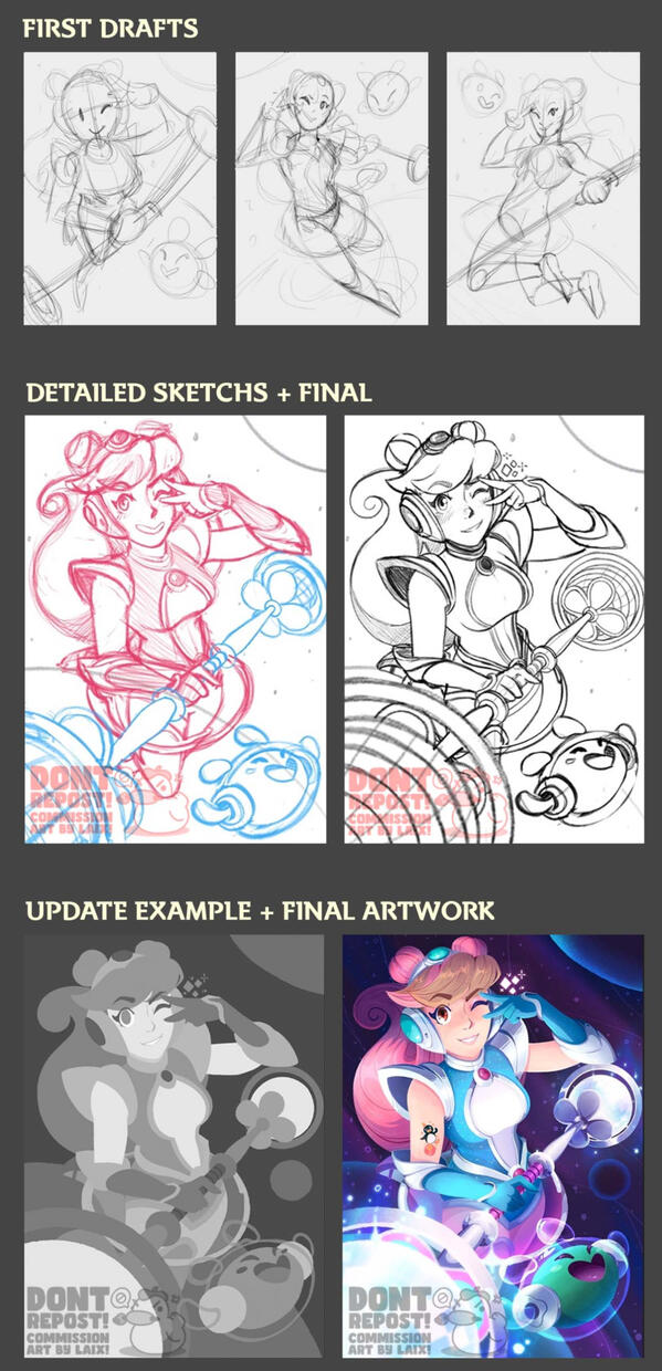 • When sending references, remember to send as many as you can! Pose, energy, clothing, design, and even color palette preferences (if any)! The idea is to get as precise on what you want as quickly as it can be, with the least amount of trouble on both ends.• During drafts, sketches, and updates, all images are sent in a lower resolution and with a W.I.P. watermark for security. Don't worry, the final piece will be sent in high resolution through email and/or a temporary link (WeTransfer), in PNG and JPEG format. Open files will not be available.• When I say that payment will be done after first drafts approval, I mean the first couple of sketches. They are more simple and quicker, just so we both can have an idea of what it will be looking at the end in terms of design, composition, pose, and not so much in detail. After its approval, you can send the payment and I'll start doing a more refined sketch, that will be more detailed and way closer to the final result. This is the time to make all the adjustments you feel it needs. Only when this version is approved, it became final and I start the cleaning up and finalization process.